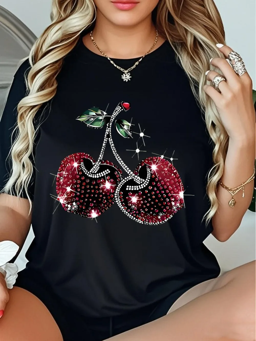 Cherry Print Top Women's Sparkling Cherry Diamond Print T-Shirt Elegant Casual Short Sleeve Round Neck Fashionconscious Women